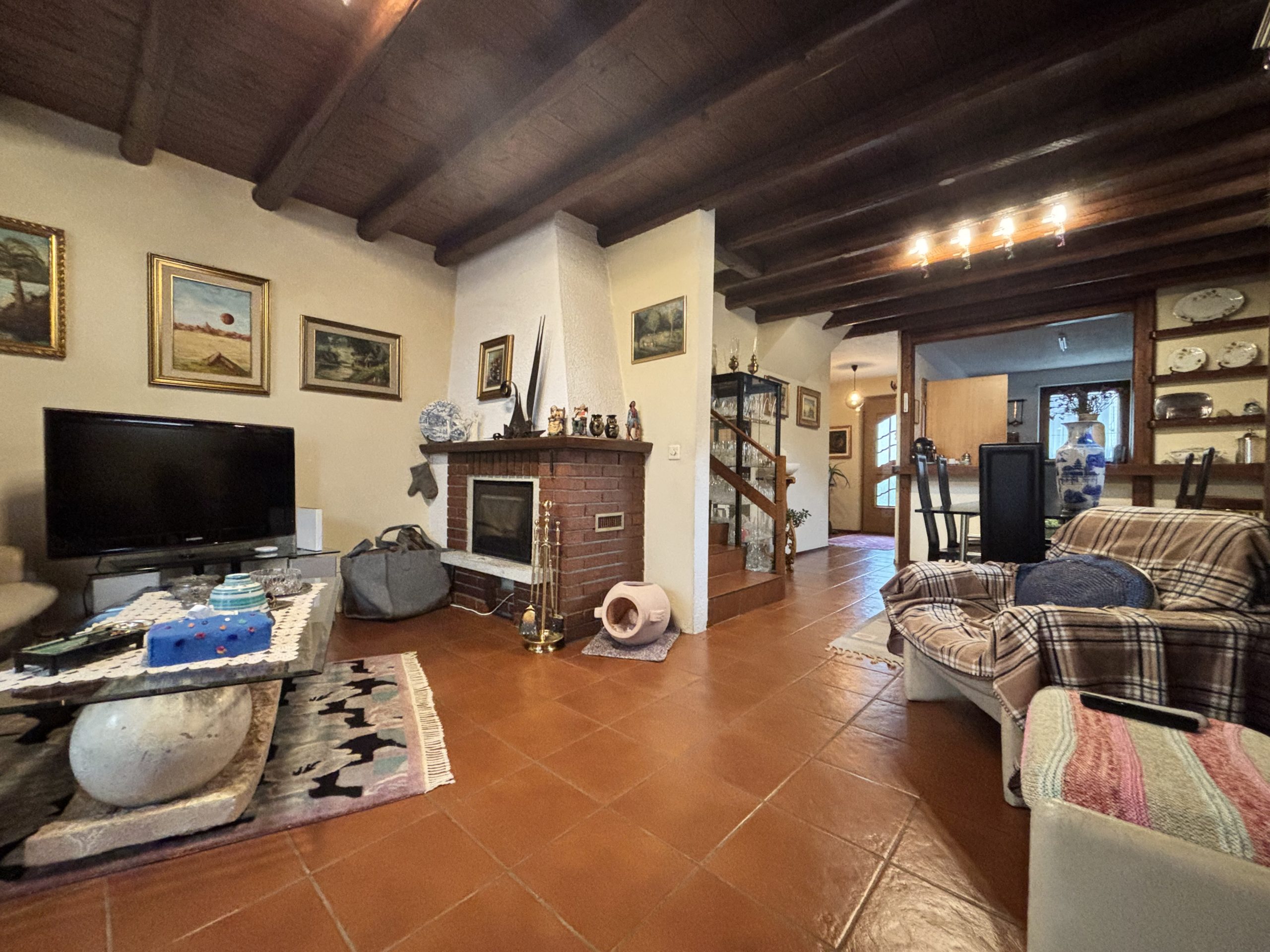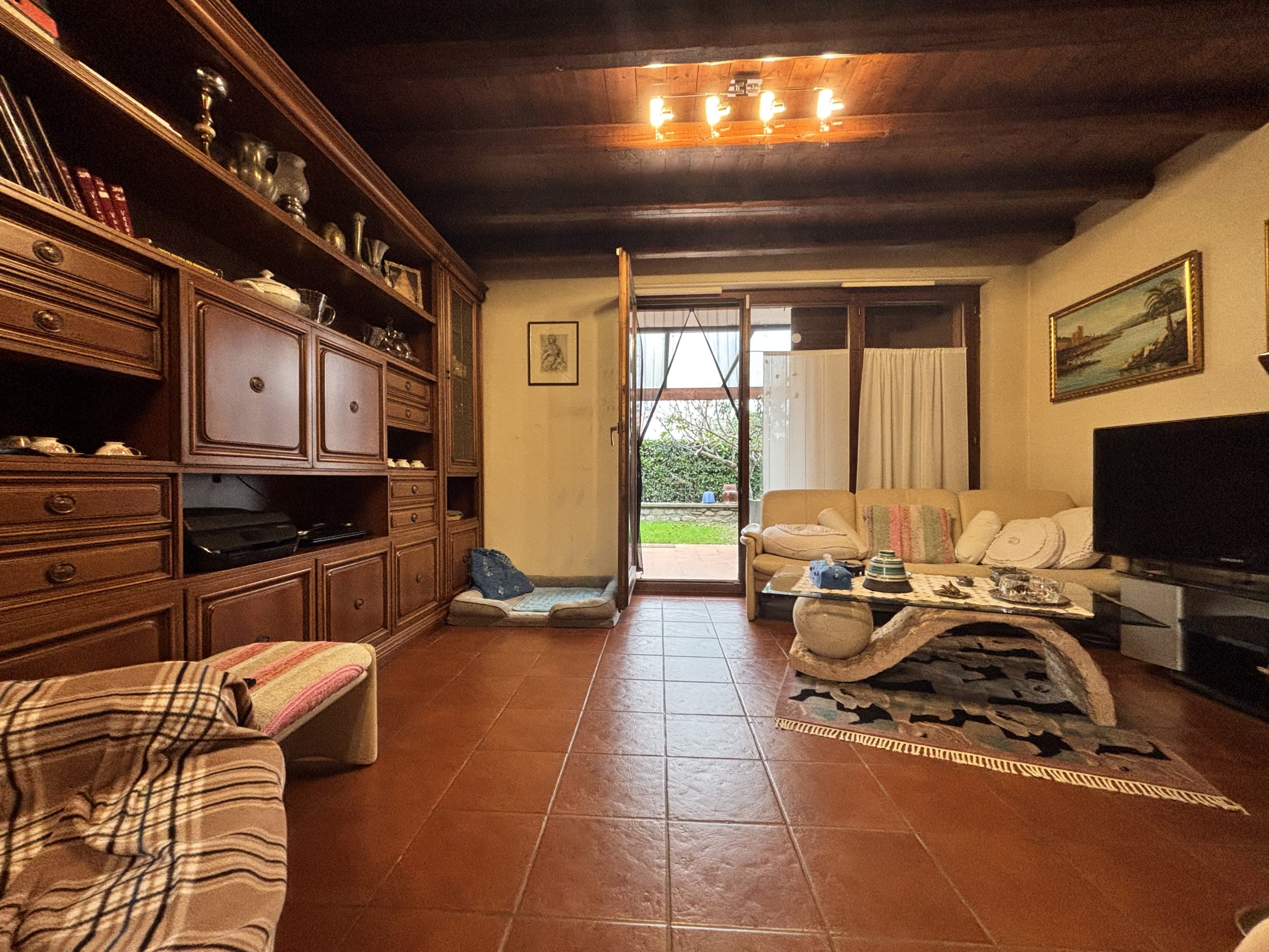 Zona giorno composta da soggiorno doppio con camino e travi a vista con accesso diretto al giardino privato